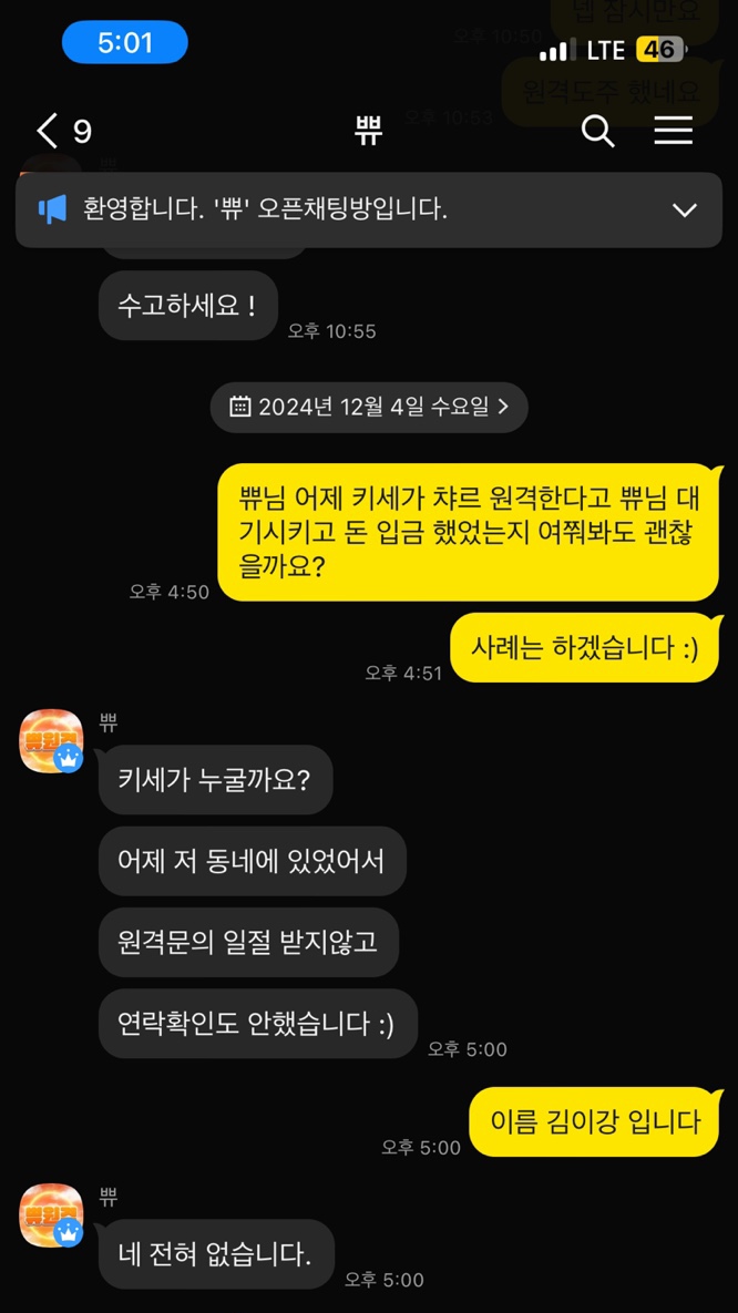 어제 오픈카톡들어가서 쀼원격방 들어갔던 거 맞고 제가 도주했네요라고 채팅친 기록 있을 거에요 물어보세요