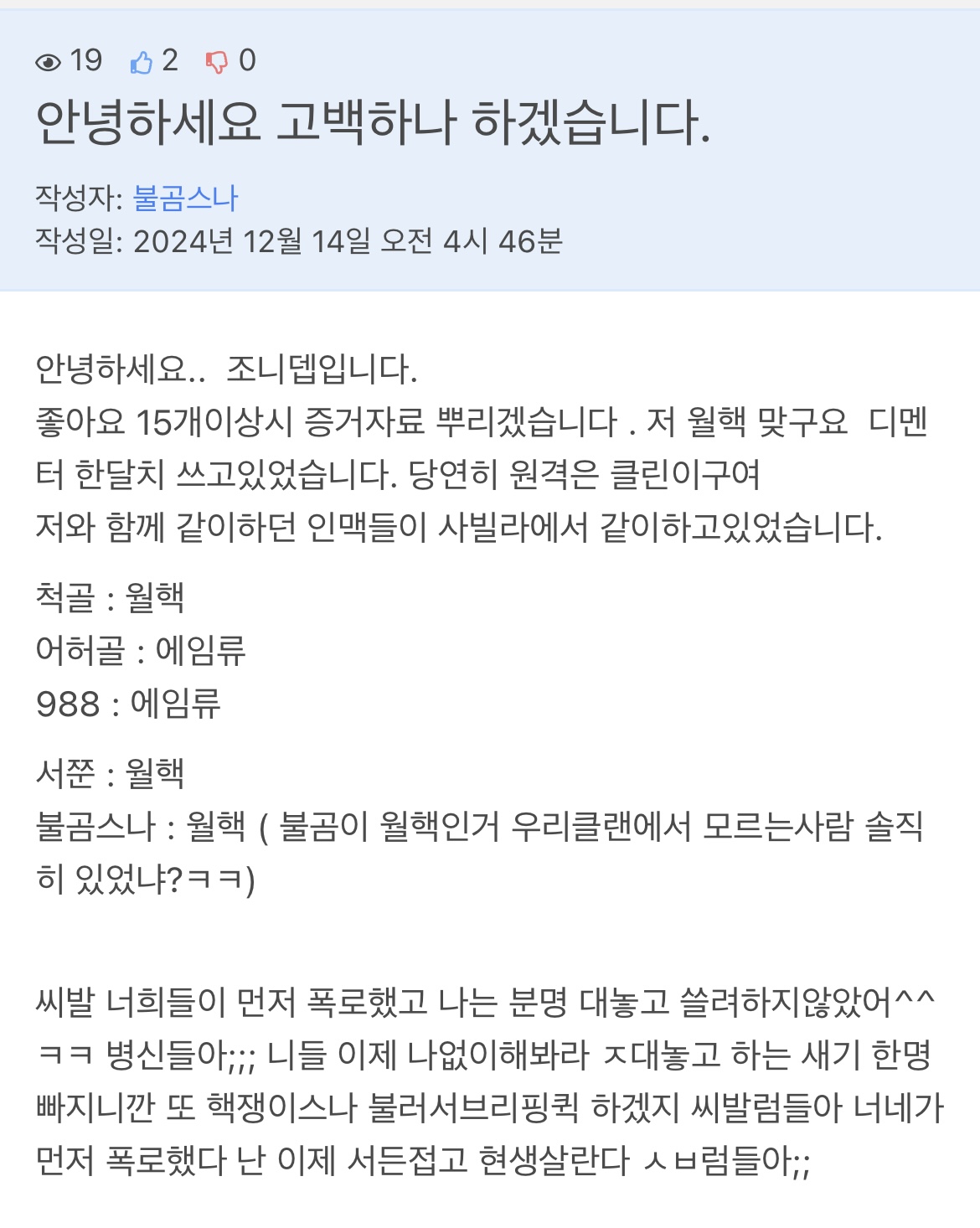 ㄹㅇ 핵 쓰는애들은 머리가 나빠서 핵을 쓰나보네... 할짓도 얼마나 없으면 이시간에 저주작질을 하고있을까...