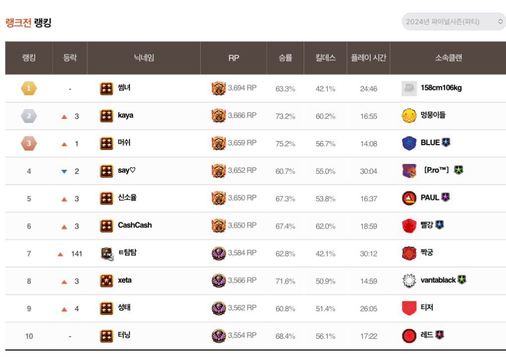 4등 say하트 요즘 파랭하는애들 피로 클랭딱까리로 간듯한데 닉네임은 익숙치않아 잘 모르겠다