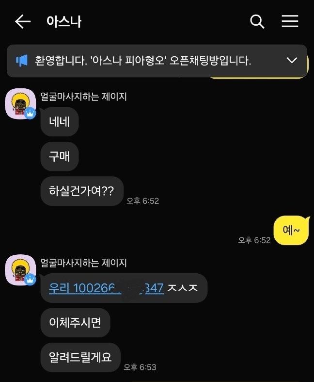 주작이다 뭐다 하면서 꼴깝 떠는 분들떄문에 그러는데 오픈톡 남겨주면 저거 계좌 번호 알려드릴테니 이체 해보실래요??ㅋㅋㅋㅋㅋㅋㅋㅋㅋㅋ 이름이 틀린가?ㅋㅋㅋㅋㅋㅋㅋㅋ 뭔 주작이예요 ㅋㅋㅋㅋ 메이비?님이 나한테 계좌를 알려줄만한 사이도 아닌데 ㅋㅋㅋㅋㅋㅋㅋㅋㅋ대화 내용 있는데 그냥 팩트만 찍어서 보낸거란다