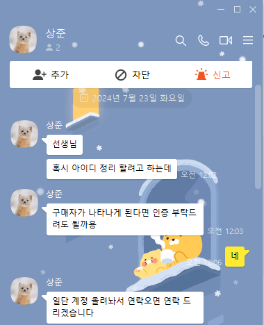 상준이가 3번째 구매자고 처음에 상준 인 줄 모르고 계정 판매했다가