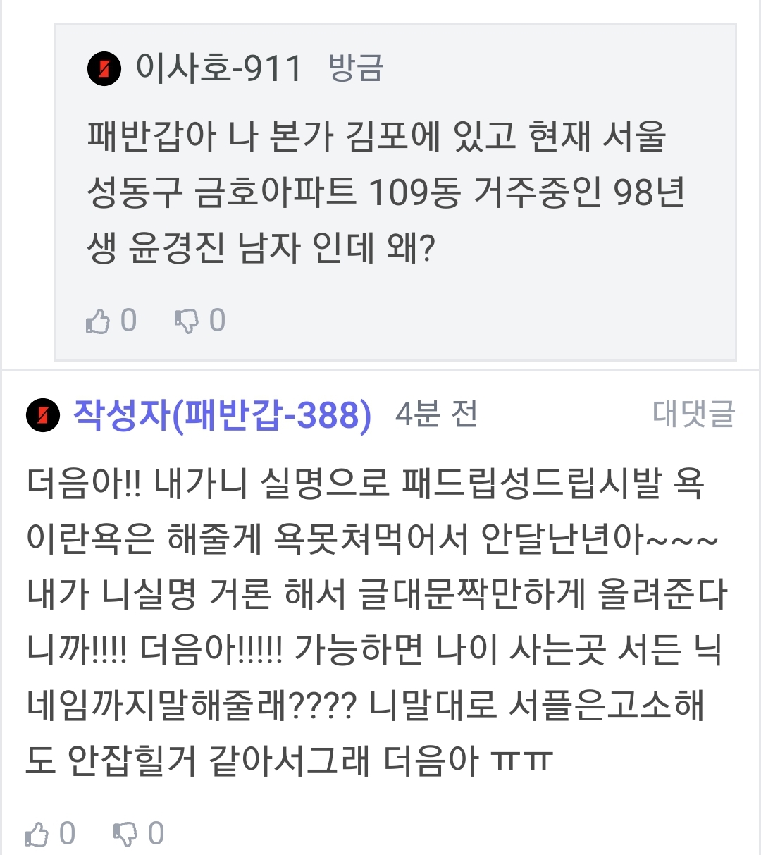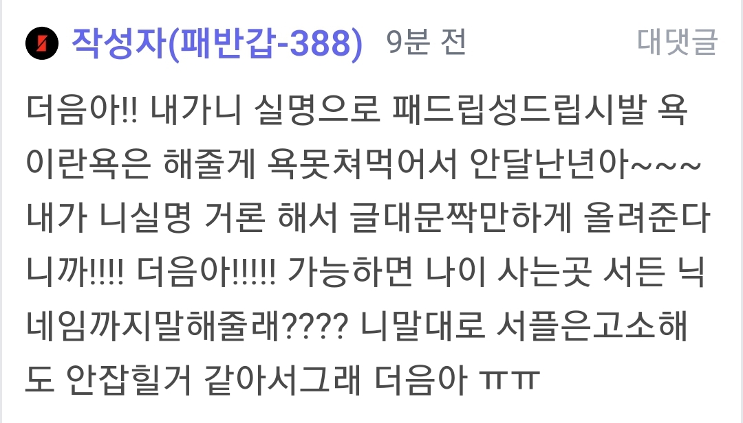 주작같으면 욕이라도 찌끄려봐 ㅋㅋㅋㅋㅋㅋㅋㅋㅋ 어차피 고소 안될텐데 ?^^