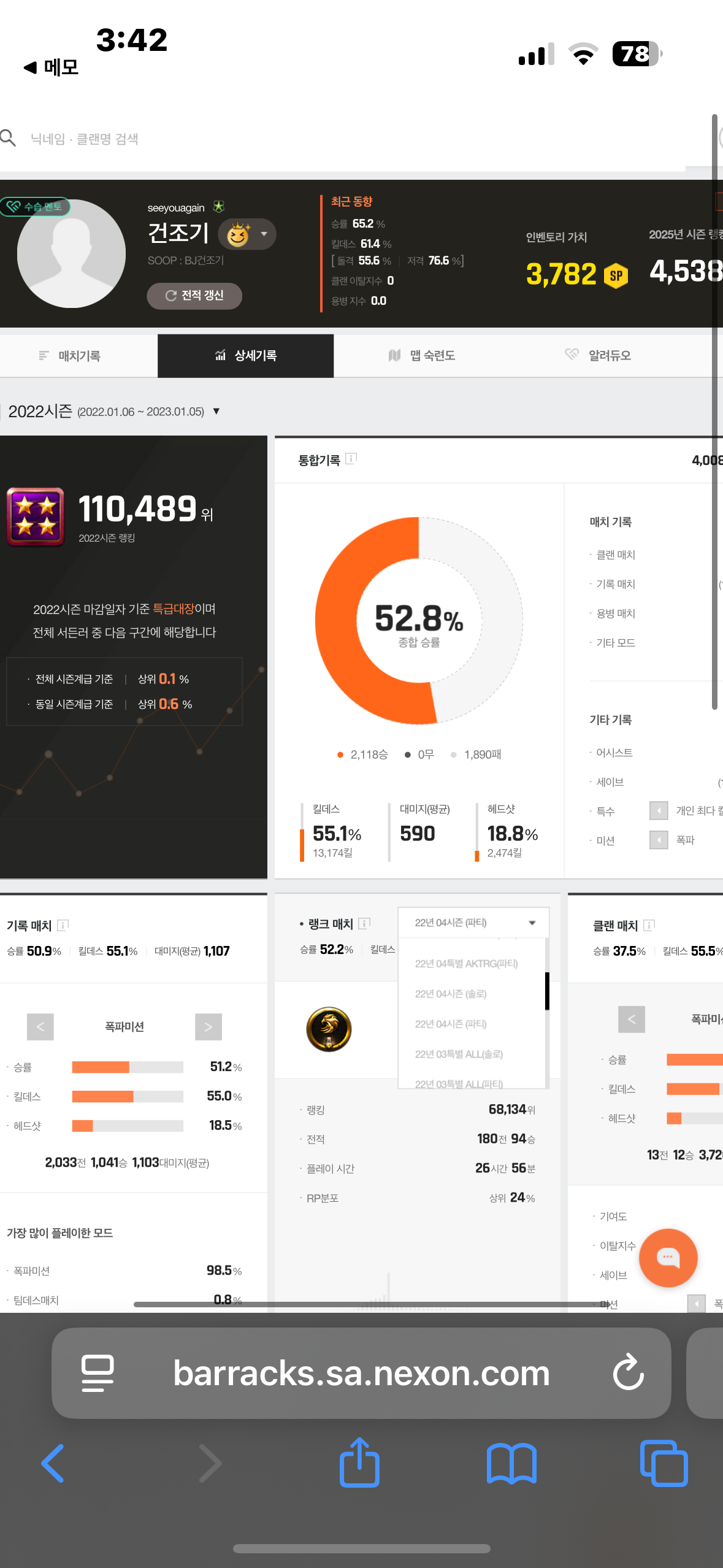 저때 랭조먹고 몇달전에 아이디샀는지 전전시즌들보면 몇백판 골딱이던데 갑자기 저때 아이디샀는지 본인인증 거부하던데 맞나요?https://barracks.sa.nexon.com/1241688323/match