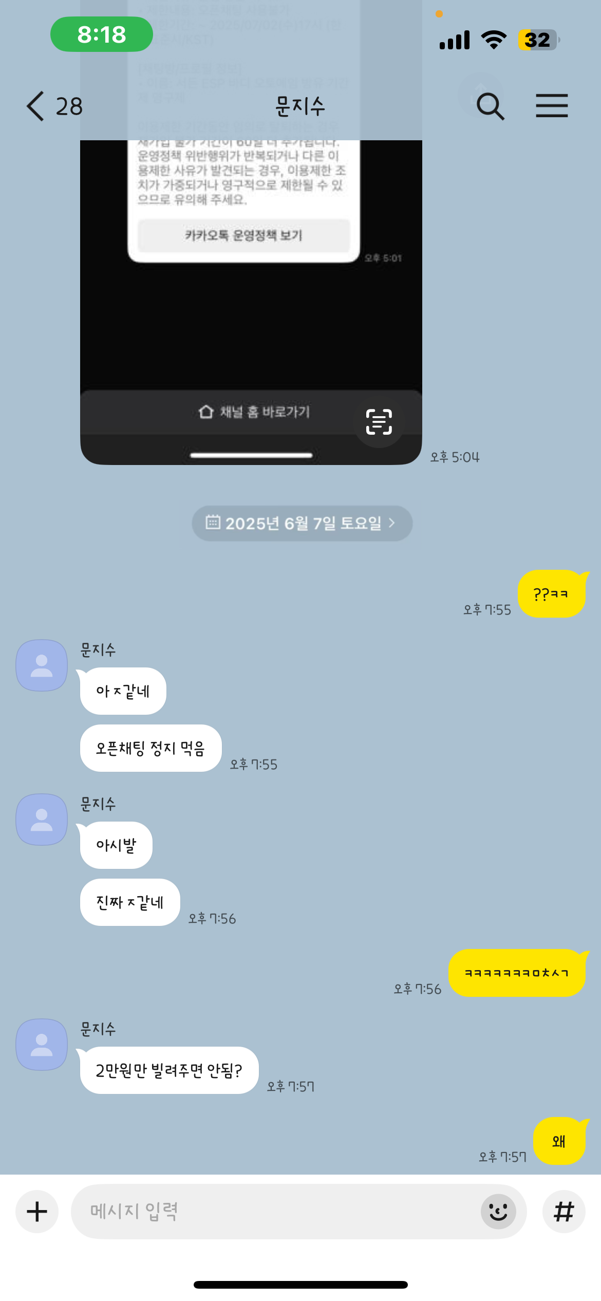 통장에 2만원도 없는 겸레인ㅋㅋ+오픈채팅 핵정지