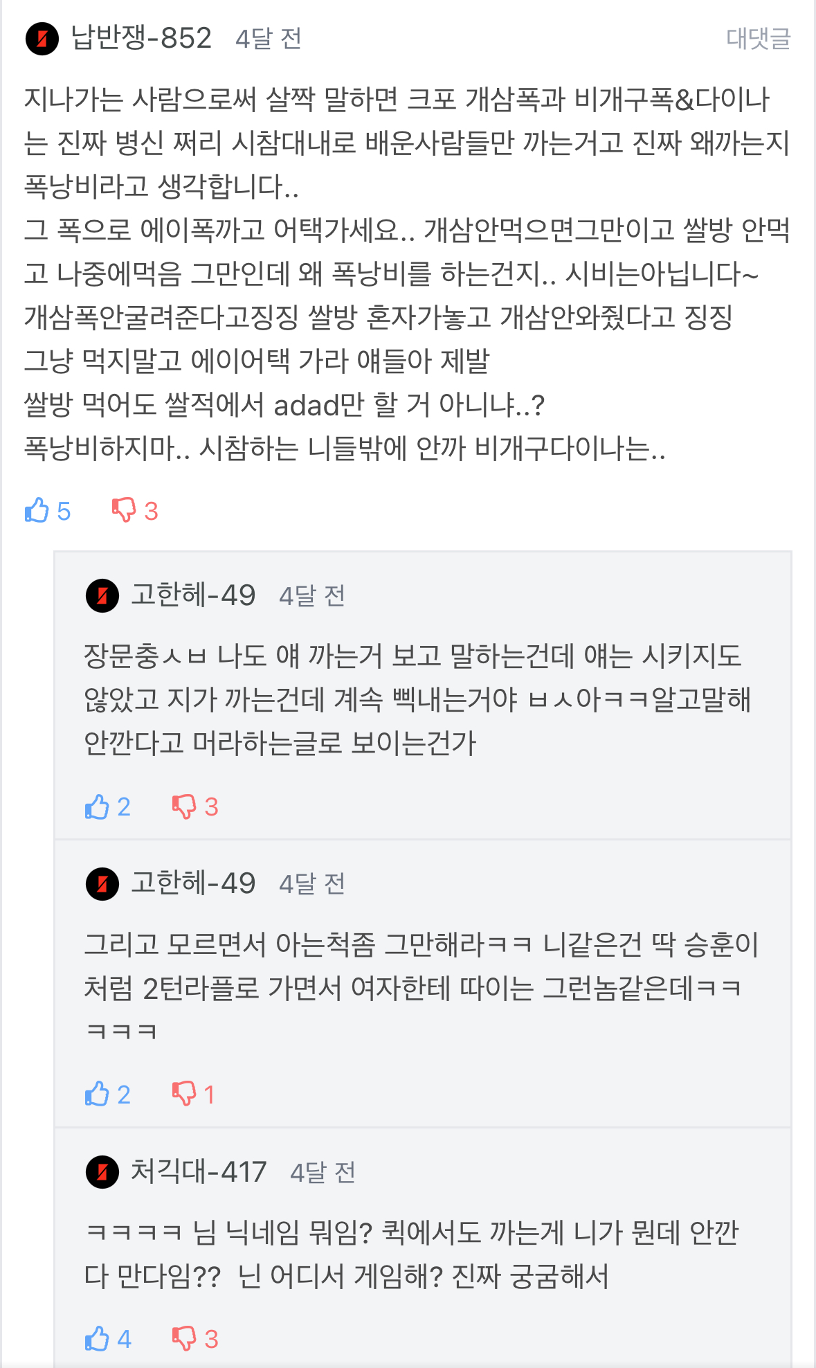 지나가는 사람으로써 살짝 말하면 크포 개삼폭과 비개구폭&다이나 는 진짜 병신 쩌리 시참대내로 배운사람들만 까는거고 진짜 왜까는지 폭낭비라고 생각합니다..