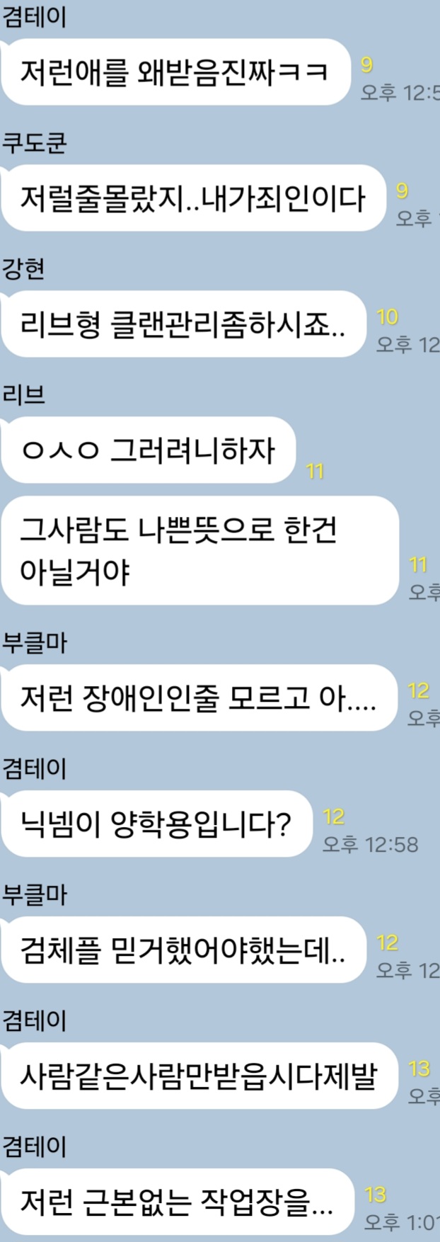 그니까 ㅋㅋㅋ 분노도 작업장이고 초반에 작업장으로 온애들이 자신의 신분을 잊고 빡사인척 구는게 역겨움 쟤들은 검체플도 못갈텐데 운좋게 클랜온걸 실력으로 온것처럼 생각함 ㅋㅋ