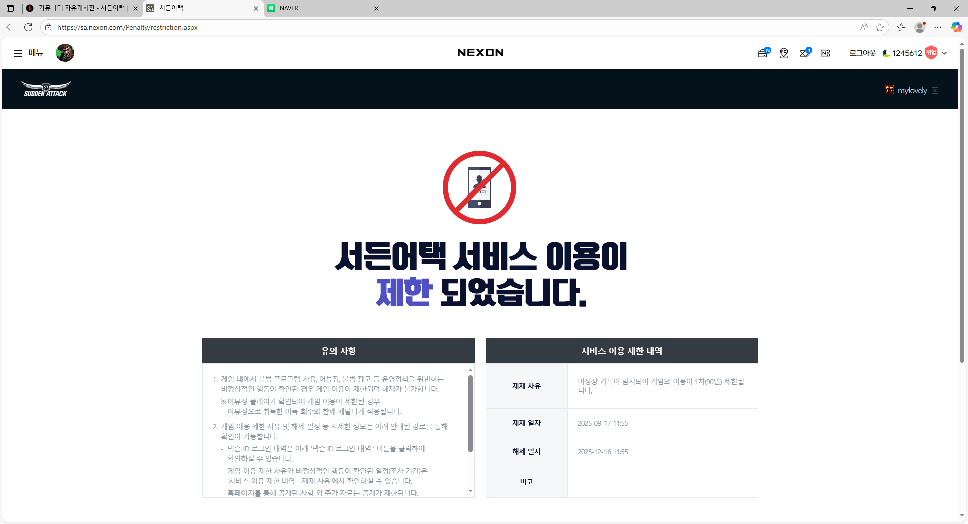 (제 아이디와 같은날 정지해제) 닉네임 Karn 켈프본캐병영: https://barracks.sa.nexon.com/1863202654/match