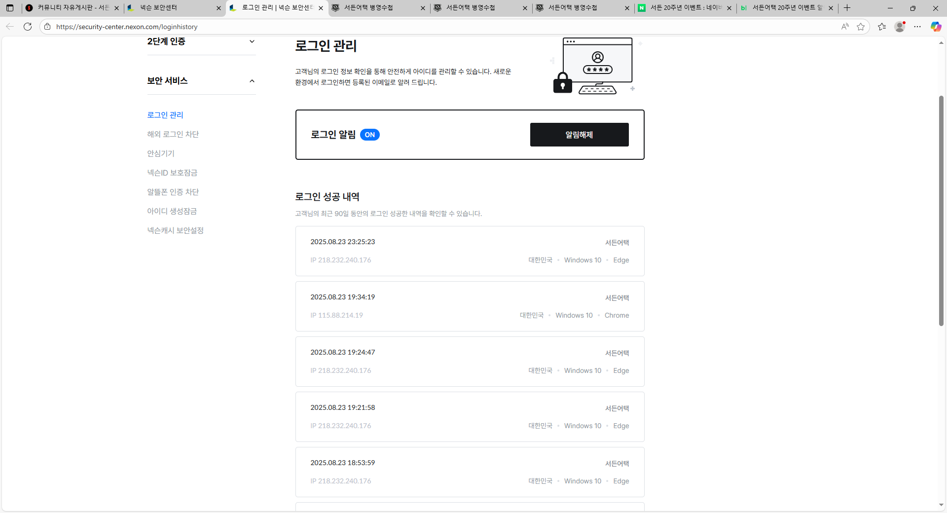 23일 로그인 내역입니다. 다른아이피 하나가 켈프 접속 아이피 입니다.