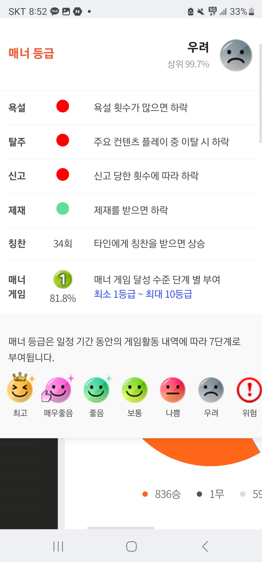 친구한테 아이디 잠시 빌려줫더니 욕을 존나하고다녀서 매너지수를 이따위로 만들었더라구,,, 랭크전하면서 5판동안 칭찬 10~20개 받았는데 이거 목요일되면 보통으로갈수있나ㅜㅜ?
