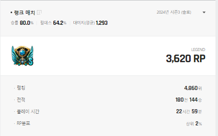 3시즌 180전 3620점 승률80.0% 킬데스64.2% 대미지(평균)1,293