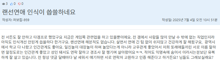 네. .? 전 저런 게시글을 작성한적이 없어요 님아.. 뭘 삭제를 하고 다시 글을 써요ㅋㅋ.. 그냥 랜선연애에 대해 쓴 글에 댓글로 몇글자 끄적인게 다인데 집에와서 서플라이 열어봤더니 이런글이 있네 ㅋㅋ 하 이제 환멸난다.. 제가 서플라이를 안들어오든지 할게요 그냥.. 평생 여기 갇혀 사십쇼.