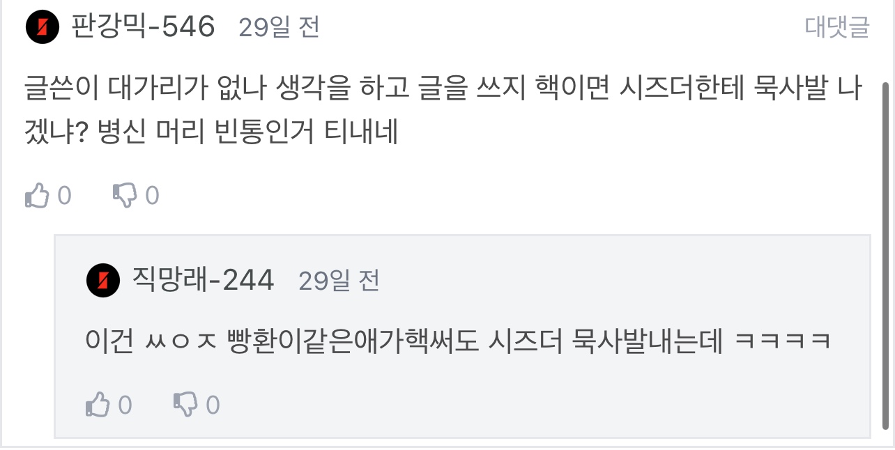 ㅇㅇ옹호하는 댓글이 저 둘밖에없음 ㅊㅎㅍㄹㅍ맞음ㅋㅋ