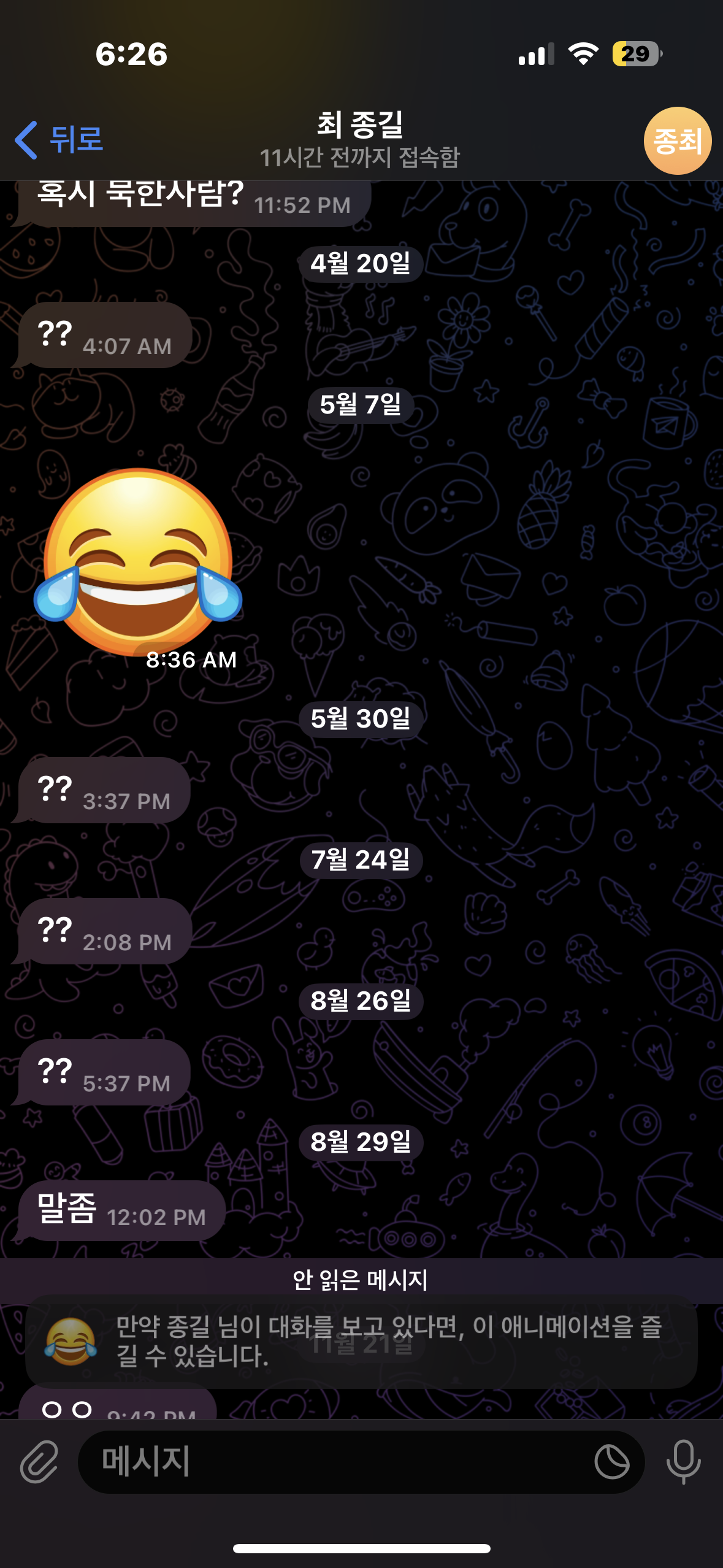 텔레 쓰는데 나 왜ㅜ자꾸 이런새끼가 채팅오냐? 달마다 시발련이