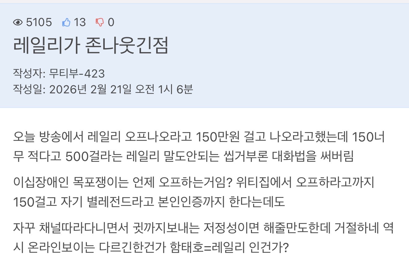 넌 레일리 그렇게 혐오하는데 레일리방송 왜 보는거임??
