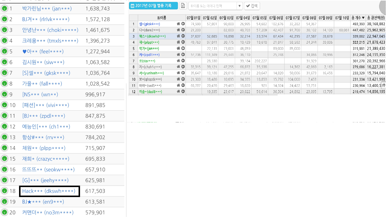 3위 허진석:154,672개 방송시간:14일21시간시급풍:433개.