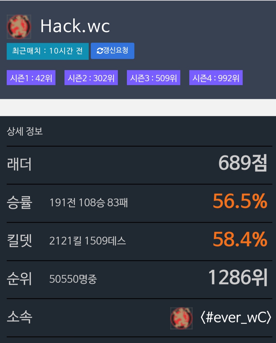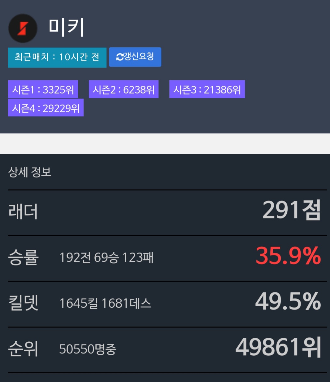 초늠망 승률 킬뎃 제대로 못보나 49퍼다 ㅋㅋ
