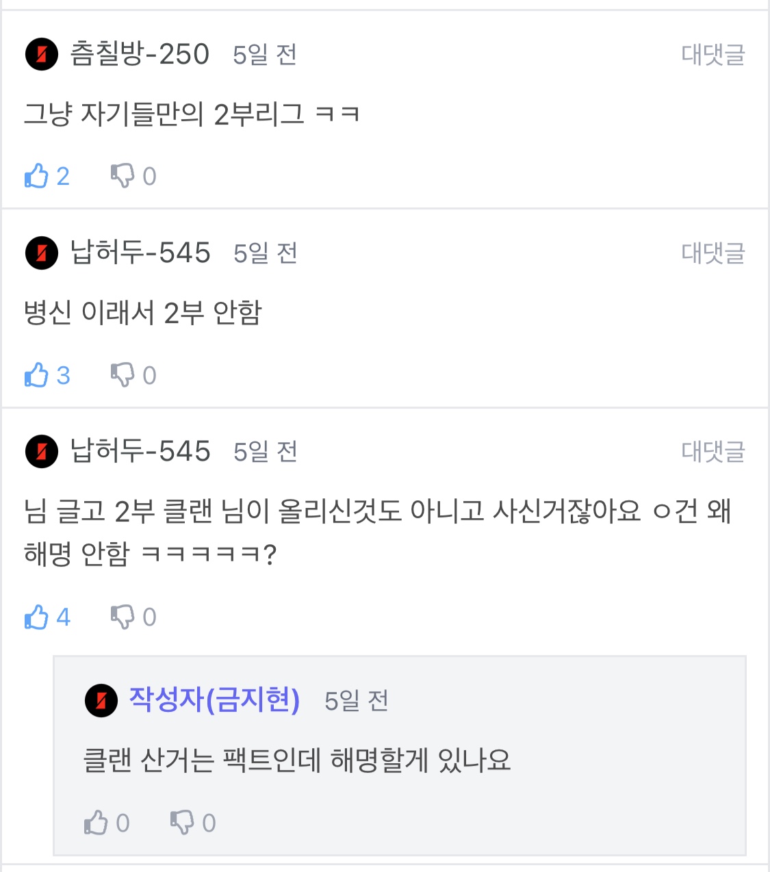 지가 지 댓글에 따봉박는 능지 수준ㅋㅋ 2부딱 이 지랄 할거면 니 클랜부터 닉네임 인게임 인증 싹다 하고 짖으셈 산딱이새끼가 무슨ㅋㅋ 그렇게 따지면 지금 내려갈 클랜이 한두개냐 병신장애인 호구새끼야