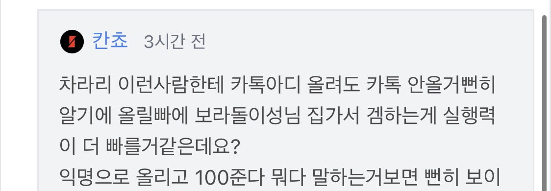 말로만 보라형집 간다고 하지말고 진짜가서 너 빡사하는 거 보여주셈 너가 너 입으로 말했잖아 보라형집가서 겜 하는게 빠를거 같다고 너가 말한 실행력 보여줘