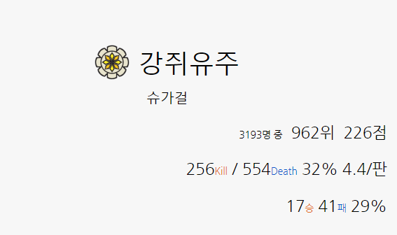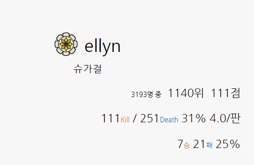 28전중 111/251이면 한판당 최대판킬이 3.9 데스도 최소 8-9인데 총4/9가 젤 잘할때네? 사람인가싶다..