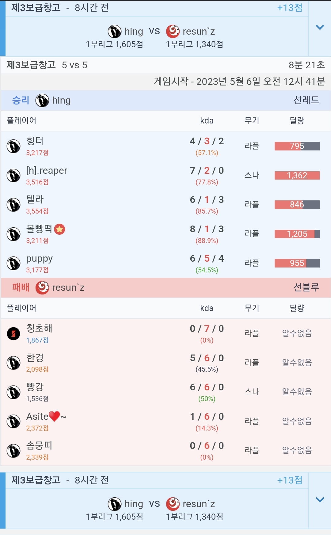 현재 빡사판이 개세훈 한명땜에 저기퀵을 거의 아무도 안해주는수준임 내전을 할거면 멤버를 섞어서 하던지 아니면 텔라핵터애쉬개세훈리퍼 저기퀵에서 타클랜을 빌리고 빵강퀵이 힝고용으로 하던지해야 논란이 없지 뭐 리썬즈나 메세 갈락 등 다른클랜들은 서플전적 별로 신경 안쓰는거같지만 힝 저멤버는 저멤버고정퀵에서 하는거 아니면 부캐로 할정도로 서플개인기록관리 심하게 하는애들임..그러면 당연히 빌려주는클랜 입장에선 기록신경안쓴다해도 안좋게 볼수밖에없음