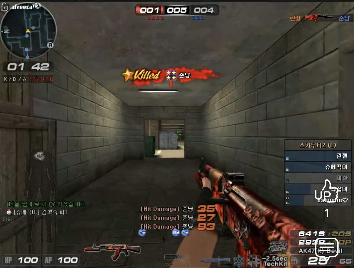 그후 설대컨위 올라가서 중통 쳐다보다가 일문이 나오자마자 에임 딱 달리붙더니 4발쏘고 4발컷함..