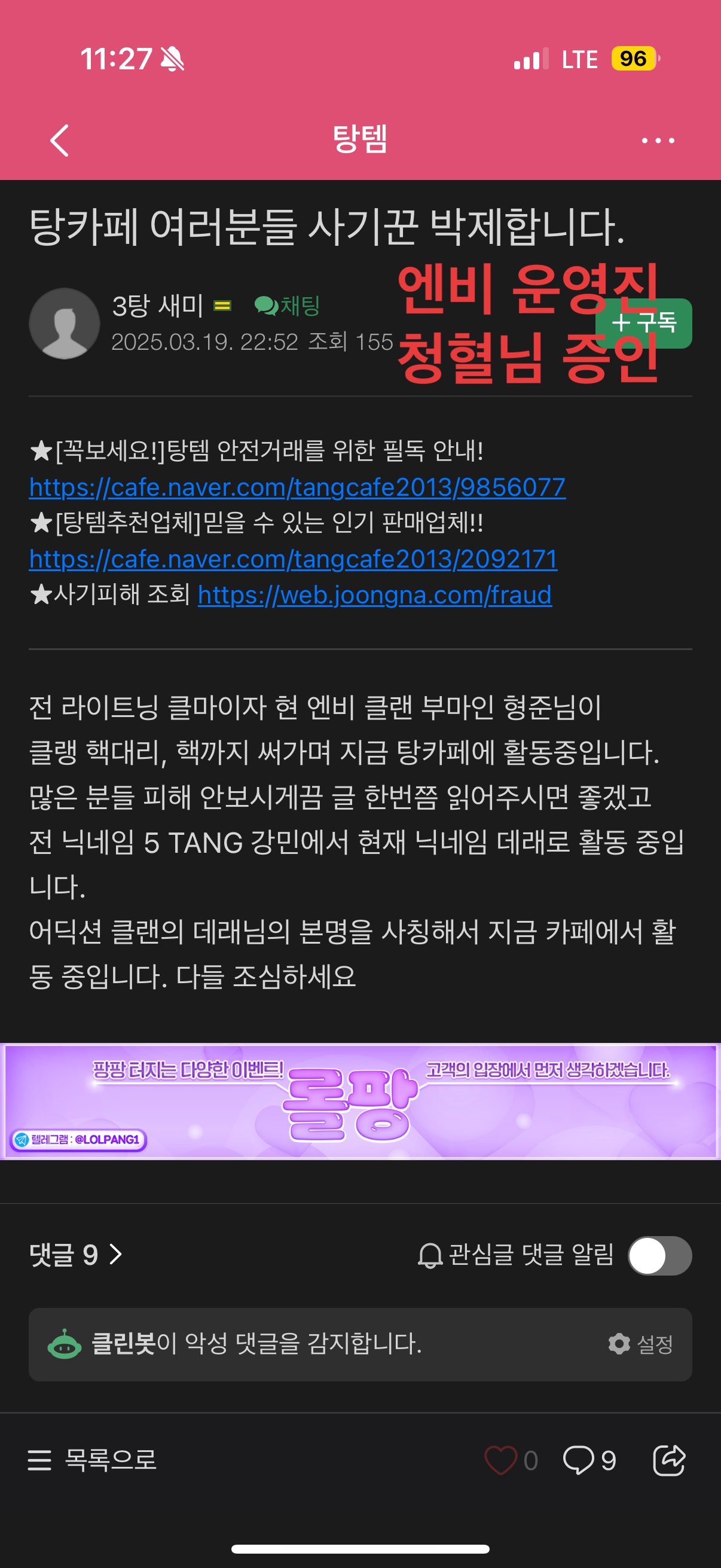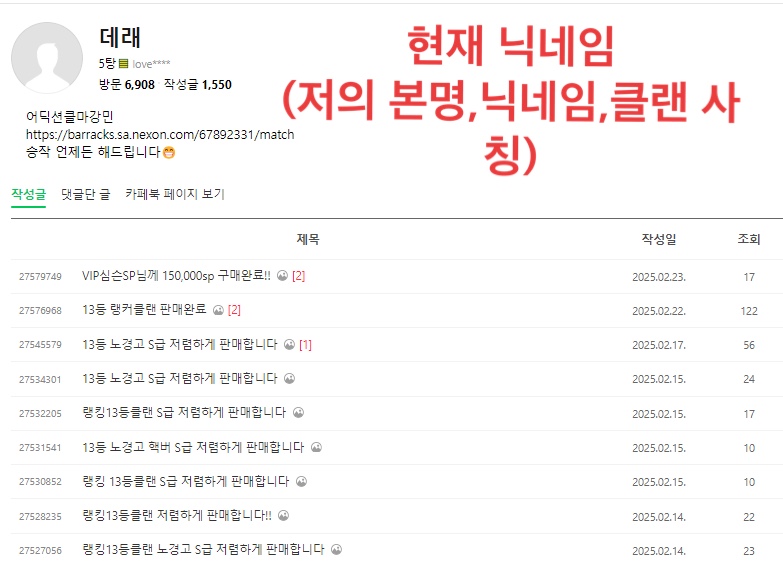일단 지금 글올라오시는거보면 엔비 클마 형준님인거 같은데 탕템에서 저를 사칭 하면서 다니시더라구요